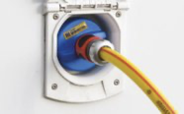 Vi har även en skarvkoppling ifall de är långt mellan vattnet och husbilen så vi kan koppla ihop två slangar om de behövs.