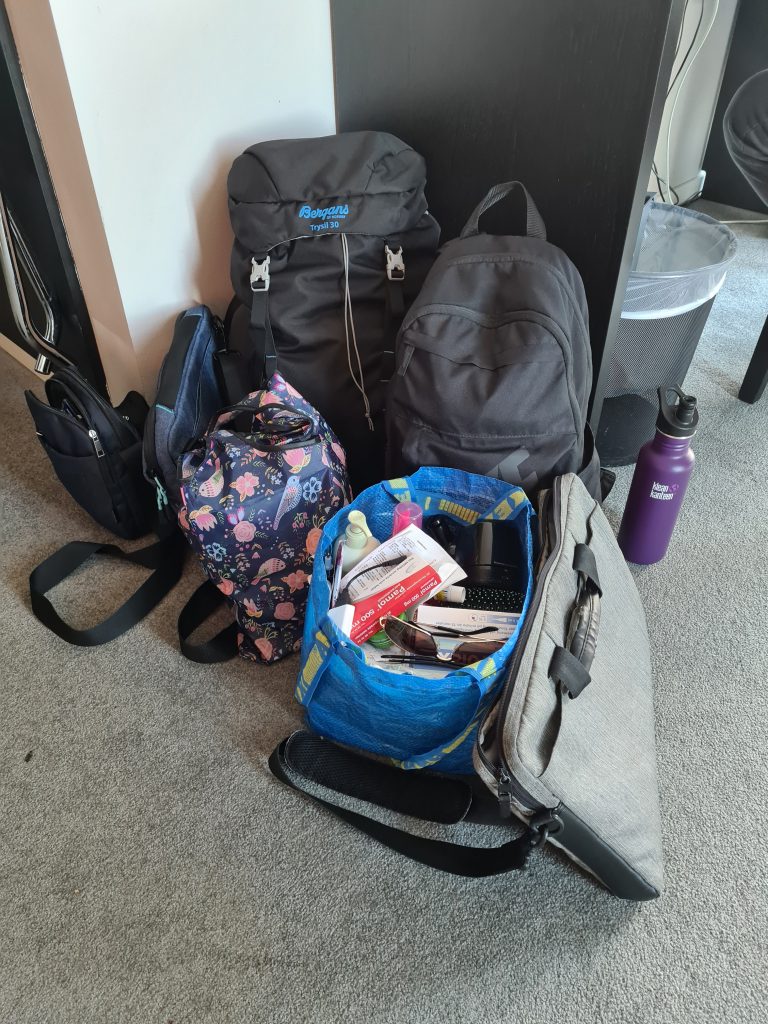 Sen jobbar vi ju dessutom med datorer, så båda våra Mac Books har vi med oss i varsin väska, sen min handväska och sen en liten påse med lite snacks 🙂